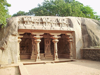 На этом месте 40 древних памятников и индуистских храмов , включая один из доверия скальных рельефов под открытым небом в мире: Сошествие Ганги или Покаяние Арджуны. Группа включает несколько категорий памятников: храмы ратха с монолитными процессионными колесницами, построенные между 630 и 668 годами; мандапа вихарас (пещерные храмы) с повествованиями из надписей Махабхарата и Шайвика , Шакти и Вайшна в количестве индийских языков и письменностей; наскальные рельефы (в частности барельефы ); каменные храмы, построенные между 695 и 722 годами, археологические раскопки, датируемые веком и ранее.